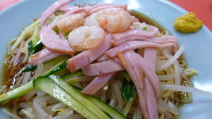 細めんの上には、エビ、ハム、きゅうり、もやしと、サッパリ素材がのっていて、つゆは酢醤油にごま油の香りが漂う夏らしい味付け。