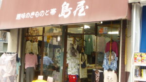 その代表的なお店が「島屋呉服店」です。ただし、赤いテントに「島屋」と書かれているように、今は、洋品店の要素が強くなっています。ここのお店の魅力は、何といってもガラスのショーケースでしょう。